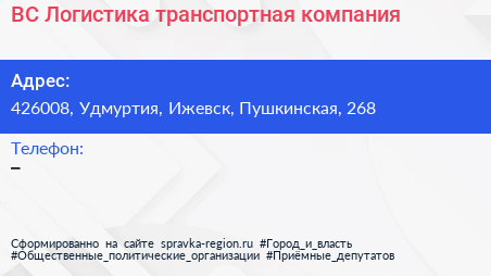 ВС-Логистика, транспортная компания по адресу 426008, Удмуртия, Ижевск, Пушкинская, 268 в дальнейшем Организация, размещена в следующих категориях: