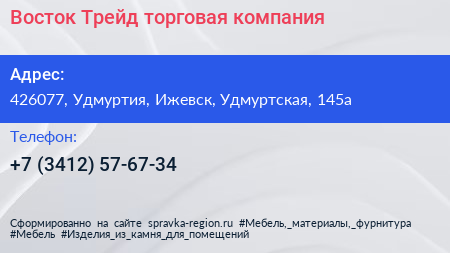 Восток Трейд, торговая компания по адресу 426077, Удмуртия, Ижевск, Удмуртская, 145а в дальнейшем Организация, размещена в следующих категориях: