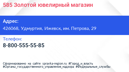 585 Золотой, ювелирный магазин по адресу 426068, Удмуртия, Ижевск, им. Петрова, 29 в дальнейшем Организация, размещена в следующих категориях: