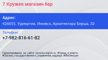7 Кружек, магазин-бар по адресу 426015, Удмуртия, Ижевск, Архитектора Берша, 32 в дальнейшем Организация, размещена в следующих категориях:
