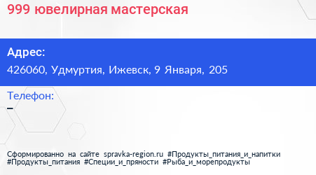 999, ювелирная мастерская по адресу 426060, Удмуртия, Ижевск, 9 Января, 205 в дальнейшем Организация, размещена в следующих категориях: