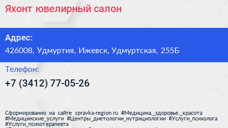 Яхонт, ювелирный салон по адресу 426008, Удмуртия, Ижевск, Удмуртская, 255Б в дальнейшем Организация, размещена в следующих категориях: