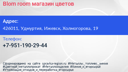 Blom-room, магазин цветов по адресу 426011, Удмуртия, Ижевск, Холмогорова, 19 в дальнейшем Организация, размещена в следующих категориях: