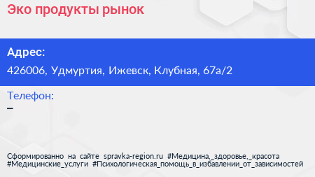Эко продукты, рынок по адресу 426006, Удмуртия, Ижевск, Клубная, 67а/2 в дальнейшем Организация, размещена в следующих категориях: