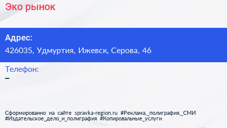 Эко-рынок по адресу 426035, Удмуртия, Ижевск, Серова, 46 в дальнейшем Организация, размещена в следующих категориях: