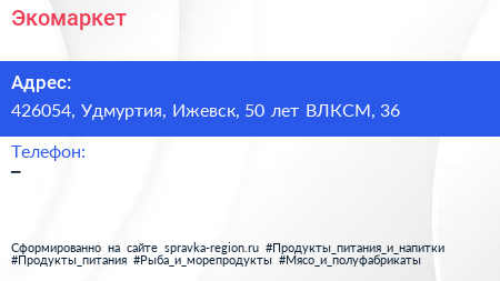Экомаркет по адресу 426054, Удмуртия, Ижевск, 50 лет ВЛКСМ, 36 в дальнейшем Организация, размещена в следующих категориях: