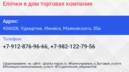 Елочки в дом, торговая компания по адресу 426028, Удмуртия, Ижевск, Маяковского, 20а в дальнейшем Организация, размещена в следующих категориях: