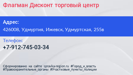 Флагман Дисконт, торговый центр по адресу 426008, Удмуртия, Ижевск, Удмуртская, 255в в дальнейшем Организация, размещена в следующих категориях: