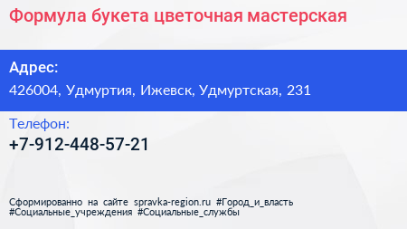 Формула букета, цветочная мастерская по адресу 426004, Удмуртия, Ижевск, Удмуртская, 231 в дальнейшем Организация, размещена в следующих категориях: