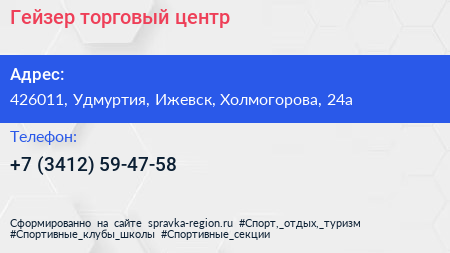 Гейзер, торговый центр по адресу 426011, Удмуртия, Ижевск, Холмогорова, 24а в дальнейшем Организация, размещена в следующих категориях: