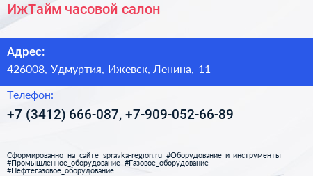 ИжТайм, часовой салон по адресу 426008, Удмуртия, Ижевск, Ленина, 11 в дальнейшем Организация, размещена в следующих категориях: