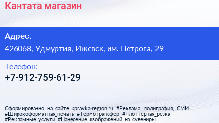 Кантата, магазин по адресу 426068, Удмуртия, Ижевск, им. Петрова, 29 в дальнейшем Организация, размещена в следующих категориях: