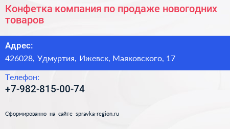 Конфетка, компания по продаже новогодних товаров по адресу 426028, Удмуртия, Ижевск, Маяковского, 17 в дальнейшем Организация, размещена в следующих категориях: