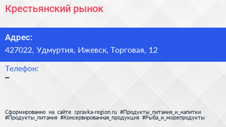 Крестьянский, рынок по адресу 427022, Удмуртия, Ижевск, Торговая, 12 в дальнейшем Организация, размещена в следующих категориях: