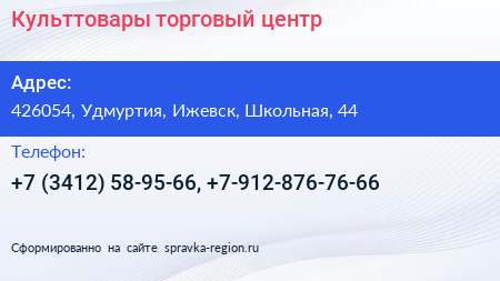 Культтовары, торговый центр по адресу 426054, Удмуртия, Ижевск, Школьная, 44 в дальнейшем Организация, размещена в следующих категориях: