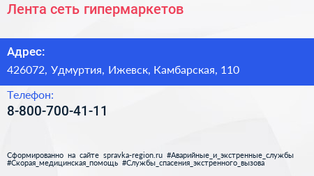 Лента, сеть гипермаркетов по адресу 426072, Удмуртия, Ижевск, Камбарская, 110 в дальнейшем Организация, размещена в следующих категориях: