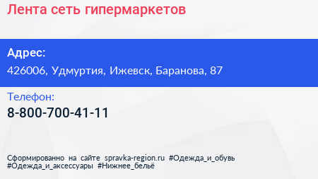 Лента, сеть гипермаркетов по адресу 426006, Удмуртия, Ижевск, Баранова, 87 в дальнейшем Организация, размещена в следующих категориях: