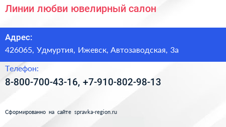 Линии любви, ювелирный салон по адресу 426065, Удмуртия, Ижевск, Автозаводская, 3а в дальнейшем Организация, размещена в следующих категориях: