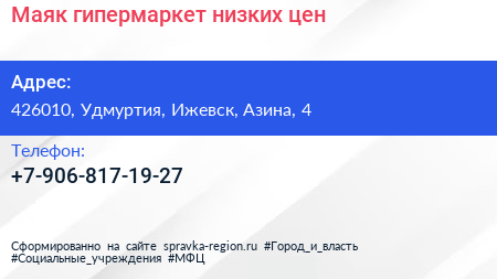 Маяк, гипермаркет низких цен по адресу 426010, Удмуртия, Ижевск, Азина, 4 в дальнейшем Организация, размещена в следующих категориях: