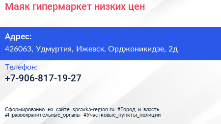 Маяк, гипермаркет низких цен по адресу 426063, Удмуртия, Ижевск, Орджоникидзе, 2д в дальнейшем Организация, размещена в следующих категориях: