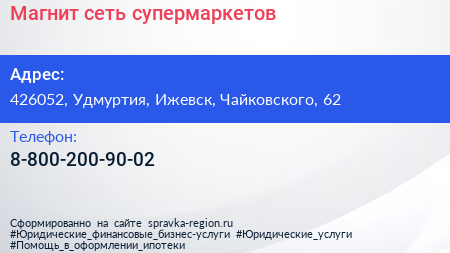 Магнит, сеть супермаркетов по адресу 426052, Удмуртия, Ижевск, Чайковского, 62 в дальнейшем Организация, размещена в следующих категориях: