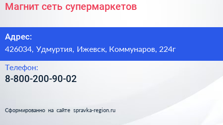 Магнит, сеть супермаркетов по адресу 426034, Удмуртия, Ижевск, Коммунаров, 224г в дальнейшем Организация, размещена в следующих категориях: