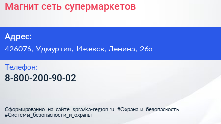 Магнит, сеть супермаркетов по адресу 426076, Удмуртия, Ижевск, Ленина, 26а в дальнейшем Организация, размещена в следующих категориях: