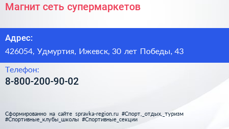 Магнит, сеть супермаркетов по адресу 426054, Удмуртия, Ижевск, 30 лет Победы, 43 в дальнейшем Организация, размещена в следующих категориях: