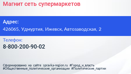 Магнит, сеть супермаркетов по адресу 426065, Удмуртия, Ижевск, Автозаводская, 2 в дальнейшем Организация, размещена в следующих категориях: