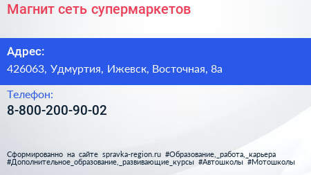 Магнит, сеть супермаркетов по адресу 426063, Удмуртия, Ижевск, Восточная, 8а в дальнейшем Организация, размещена в следующих категориях: