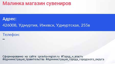 Малинка, магазин сувениров по адресу 426008, Удмуртия, Ижевск, Удмуртская, 255в в дальнейшем Организация, размещена в следующих категориях:
