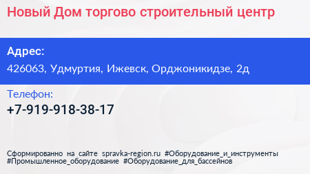Новый Дом, торгово-строительный центр по адресу 426063, Удмуртия, Ижевск, Орджоникидзе, 2д в дальнейшем Организация, размещена в следующих категориях:
