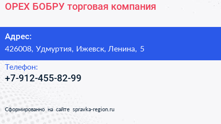 ОРЕХ БОБРУ, торговая компания по адресу 426008, Удмуртия, Ижевск, Ленина, 5 в дальнейшем Организация, размещена в следующих категориях: