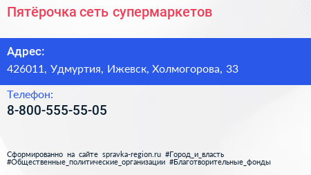 Пятёрочка, сеть супермаркетов по адресу 426011, Удмуртия, Ижевск, Холмогорова, 33 в дальнейшем Организация, размещена в следующих категориях: