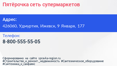 Пятёрочка, сеть супермаркетов по адресу 426060, Удмуртия, Ижевск, 9 Января, 177 в дальнейшем Организация, размещена в следующих категориях: