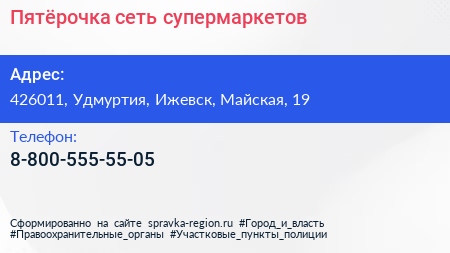 Пятёрочка, сеть супермаркетов по адресу 426011, Удмуртия, Ижевск, Майская, 19 в дальнейшем Организация, размещена в следующих категориях: