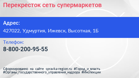 Перекресток, сеть супермаркетов по адресу 427022, Удмуртия, Ижевск, Высотная, 1Б в дальнейшем Организация, размещена в следующих категориях: