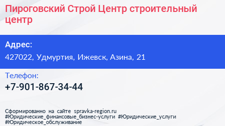 Пироговский Строй-Центр, строительный центр по адресу 427022, Удмуртия, Ижевск, Азина, 21 в дальнейшем Организация, размещена в следующих категориях: