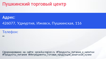 Пушкинский, торговый центр по адресу 426077, Удмуртия, Ижевск, Пушкинская, 116 в дальнейшем Организация, размещена в следующих категориях: