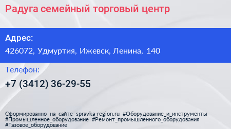 Радуга, семейный торговый центр по адресу 426072, Удмуртия, Ижевск, Ленина, 140 в дальнейшем Организация, размещена в следующих категориях: