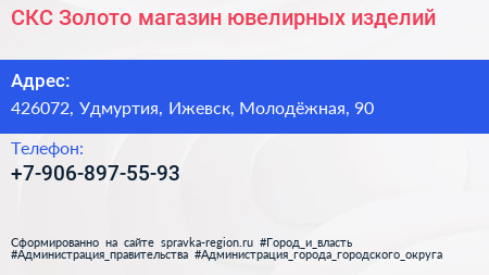 СКС Золото, магазин ювелирных изделий по адресу 426072, Удмуртия, Ижевск, Молодёжная, 90 в дальнейшем Организация, размещена в следующих категориях:
