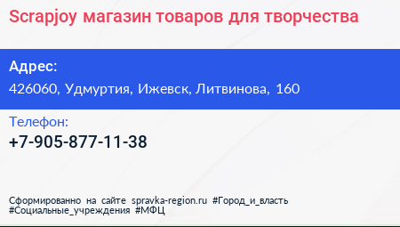 Scrapjoy, магазин товаров для творчества по адресу 426060, Удмуртия, Ижевск, Литвинова, 160 в дальнейшем Организация, размещена в следующих категориях: