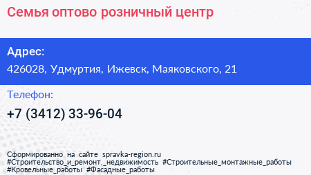 Семья, оптово-розничный центр по адресу 426028, Удмуртия, Ижевск, Маяковского, 21 в дальнейшем Организация, размещена в следующих категориях: