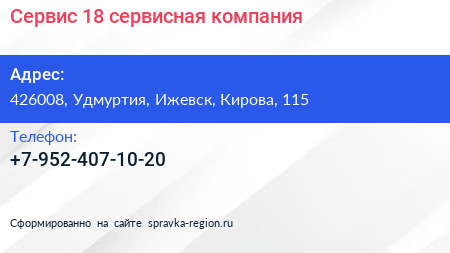 Сервис-18, сервисная компания по адресу 426008, Удмуртия, Ижевск, Кирова, 115 в дальнейшем Организация, размещена в следующих категориях: