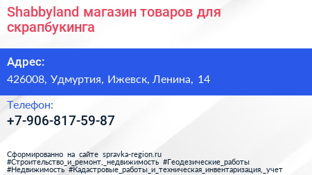Shabbyland, магазин товаров для скрапбукинга по адресу 426008, Удмуртия, Ижевск, Ленина, 14 в дальнейшем Организация, размещена в следующих категориях: