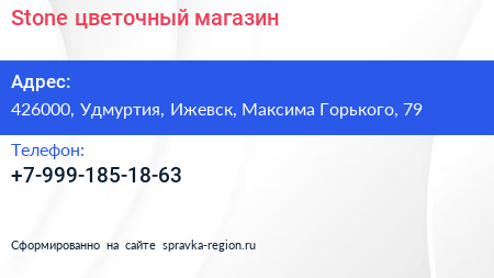 Stone, цветочный магазин по адресу 426000, Удмуртия, Ижевск, Максима Горького, 79 в дальнейшем Организация, размещена в следующих категориях:
