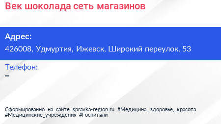 Век шоколада, сеть магазинов по адресу 426008, Удмуртия, Ижевск, Широкий переулок, 53 в дальнейшем Организация, размещена в следующих категориях: