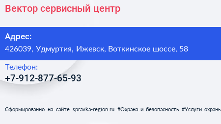 Вектор, сервисный центр по адресу 426039, Удмуртия, Ижевск, Воткинское шоссе, 58 в дальнейшем Организация, размещена в следующих категориях: