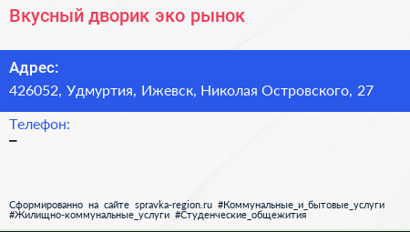 Вкусный дворик, эко-рынок по адресу 426052, Удмуртия, Ижевск, Николая Островского, 27 в дальнейшем Организация, размещена в следующих категориях: