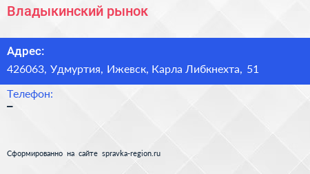 Владыкинский рынок по адресу 426063, Удмуртия, Ижевск, Карла Либкнехта, 51 в дальнейшем Организация, размещена в следующих категориях: